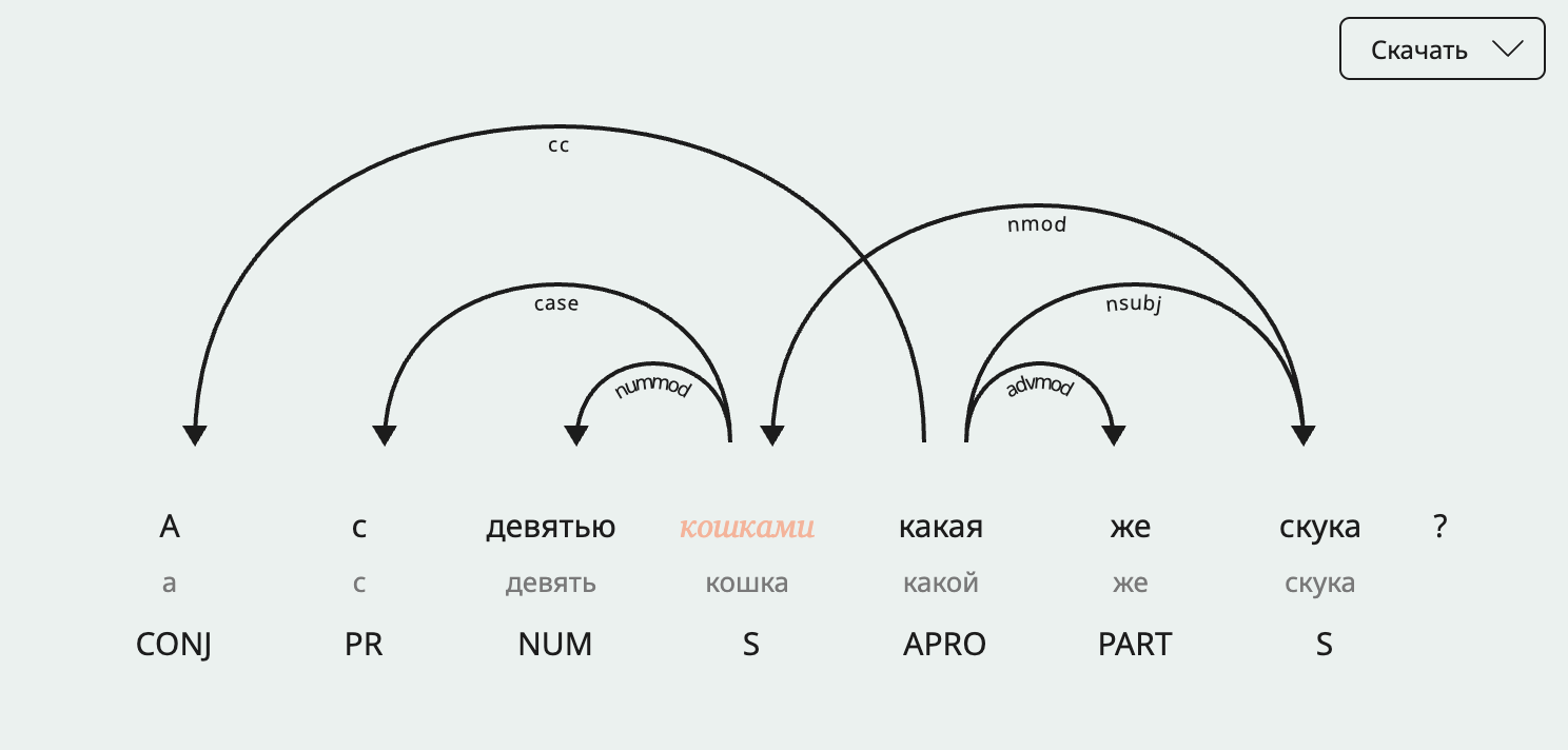 In corpora with automatic syntactic annotation (the Main Corpus, National and Regional Media, "From 2 to 15", and Russian Classics), it is now possible to view the syntactic tree of a sentence. The tree can be opened by clicking a special icon next to any snippet for all the sentences within it. For each word in the sentence, the lemma and POS label are shown, and syntactic relationships between words are displayed as labeled, directed arrows. The tree diagram can be downloaded as an image.